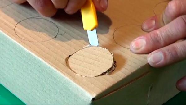 Valmistus on hyvin yksinkertainen, mutta se vie muutaman minuutin aikaa. Aluksi meidän on leikattava joitakin ympyröitä pahvilaatikossa Leikkurin avulla niiden halkaisija on suurin piirtein sama kuin telojen. Saavuttaaksemme siistimmän lopputuloksen, voimme merkitä ympyrän laatikkoon ennen leikkaamista käyttämällä kompassia tai itse paperirullaa. Myöhemmin, asetamme rullat reikiin että leikkasimme laatikkoon. Voit kiinnittää ne käyttämällä myrkytöntä liimaa.